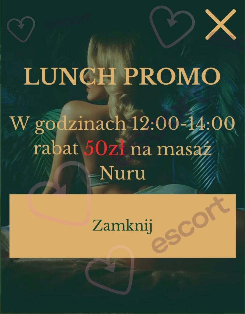 Masaż Nuru (300 zł/h, 250 zł/30min) - to masaż całego ciała wykonywany przy użyciu specjalnego olejku, lub żelu który sprawia, że doznania są wyjątkowo intensywne i relaksujące. Sesja odbywa się na macie, a Masażystka, używając swojego nagiego ciała – brzucha, piersi oraz pupy – masuje Twoje nagie ciało, pobudzając zmysły i wprowadzając w stan głębokiego erotycznego odprężenia. Masaż obejmuje również masaż lingam. Na miejscu można wybrać dowolne dodatki, aby jeszcze bardziej urozmaicić masaż i dopasować go do własnych oczekiwań.